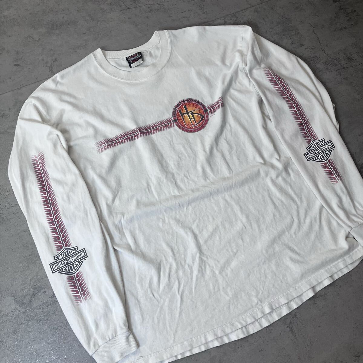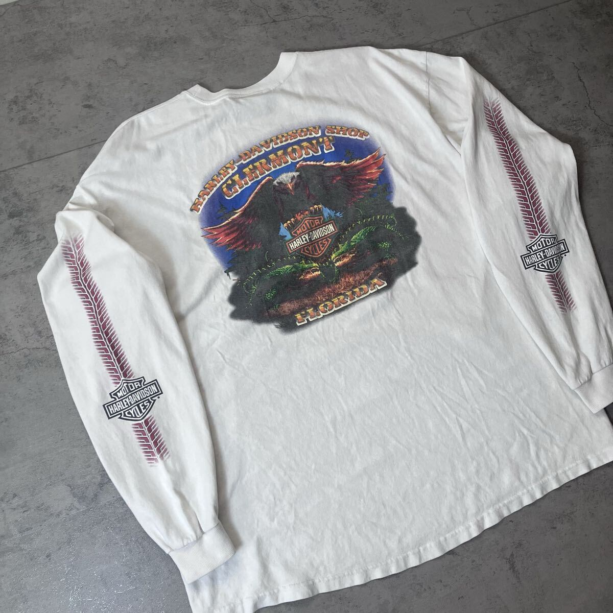 00s ハーレーダビッドソン ロングスリーブ Tシャツ 両袖プリント XL イーグル×ワニ ホワイト フェード
