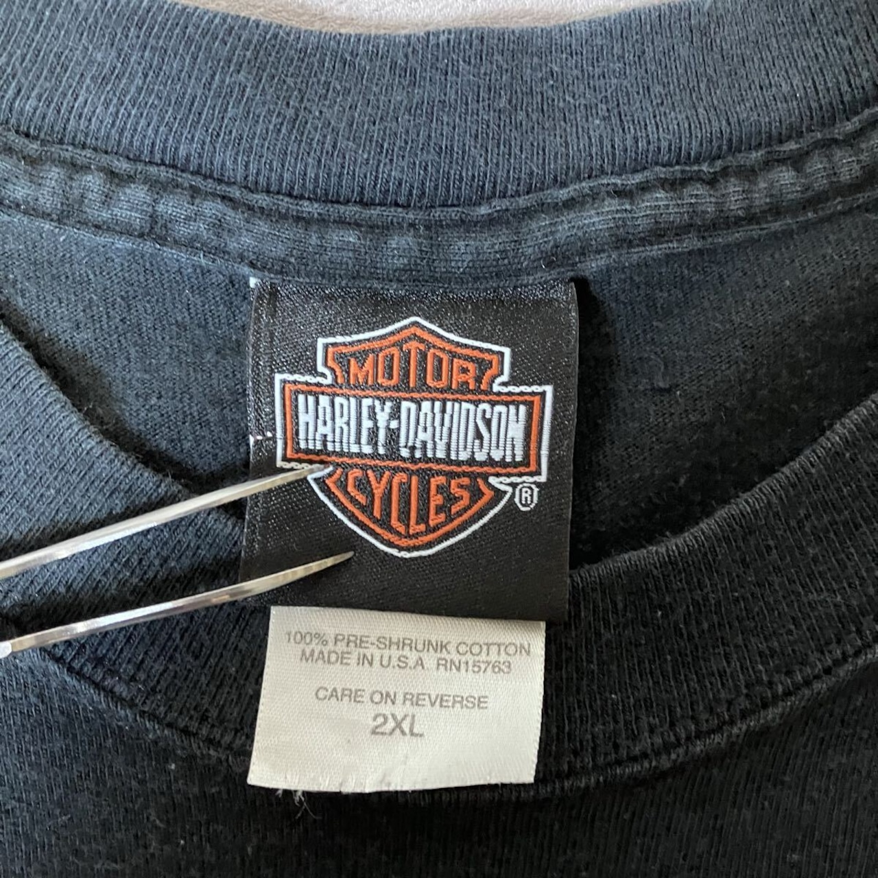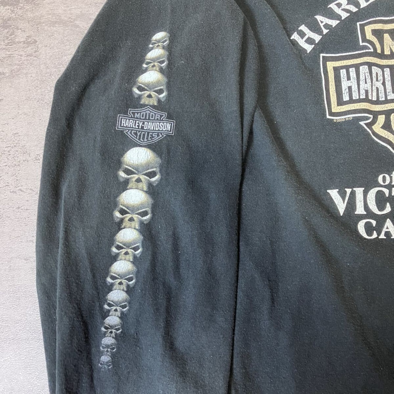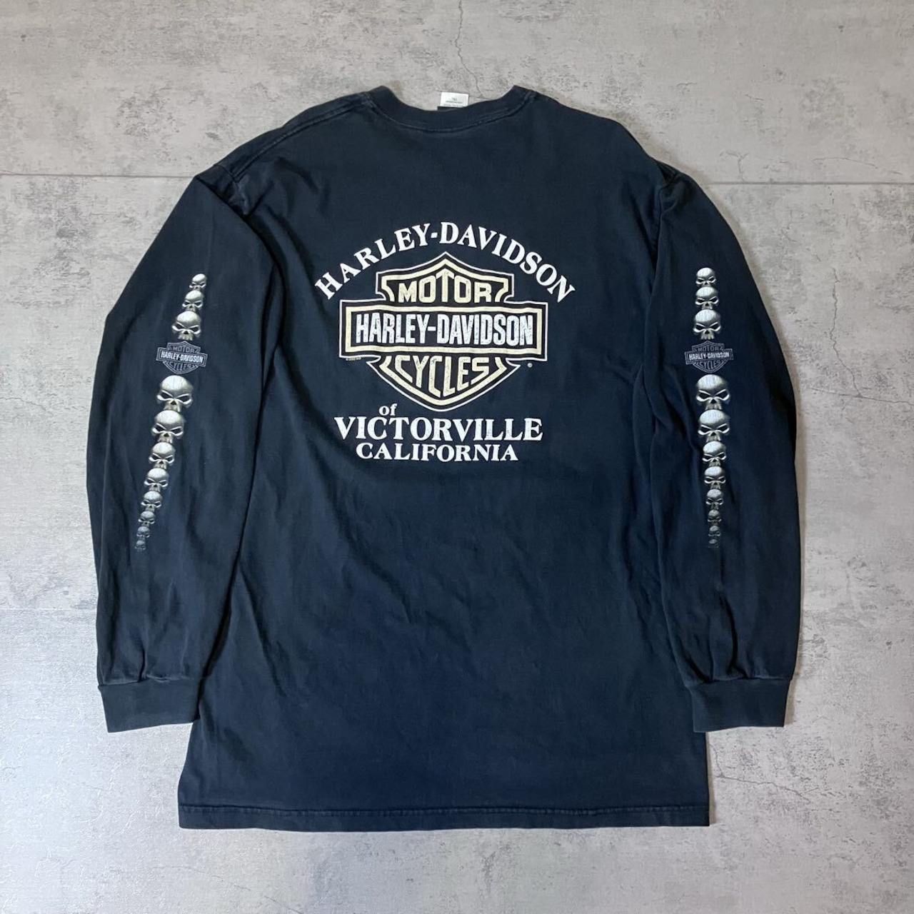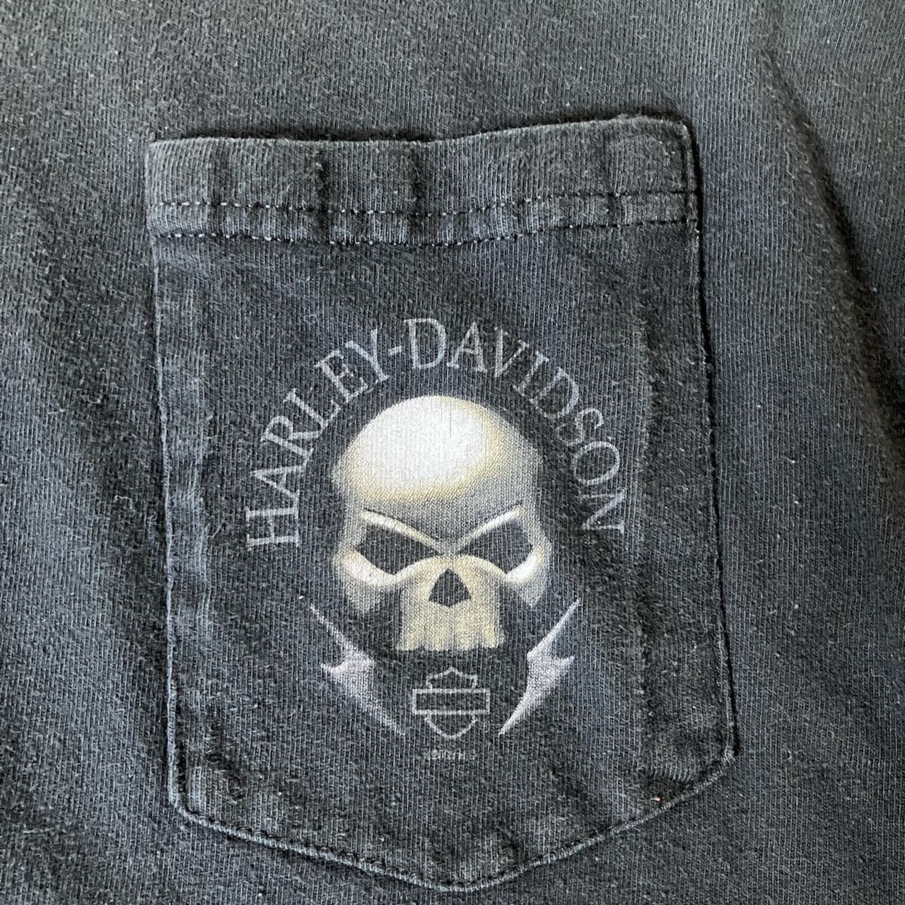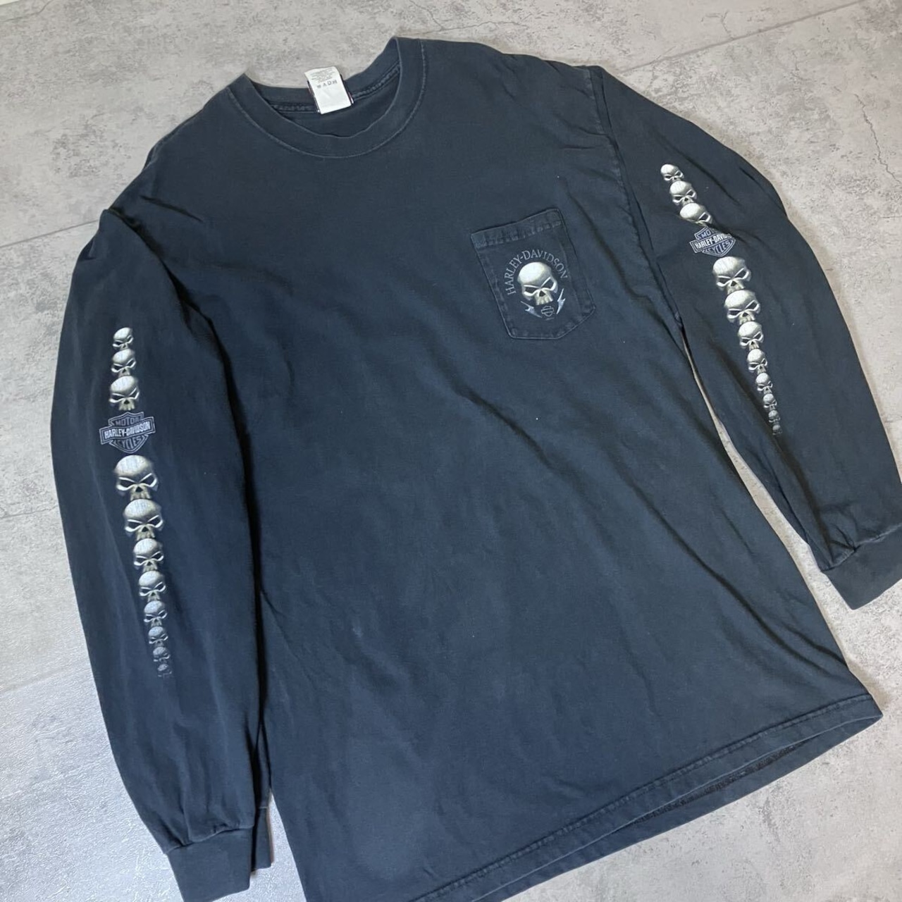 00s USA製 Harley-Davidson ロンT スカル 両袖プリント ポケット付き ブラック 2XL