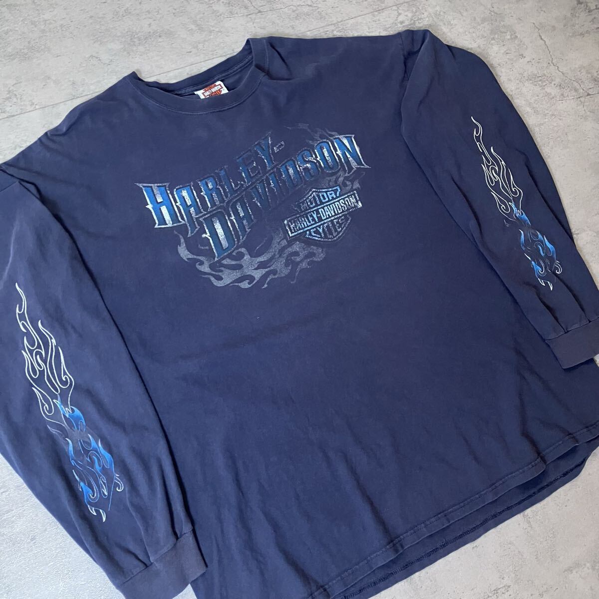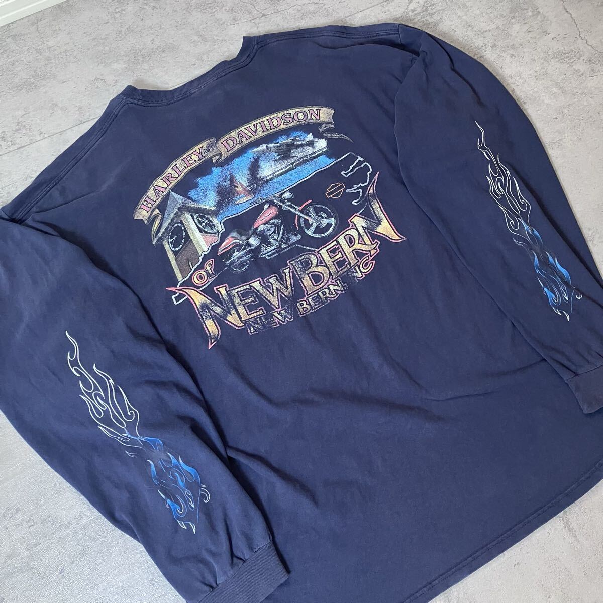 00s Harley-Davidson ロンT 両袖ブルーフレイム ファイヤーパターン NEW BERN ネイビー 2XL