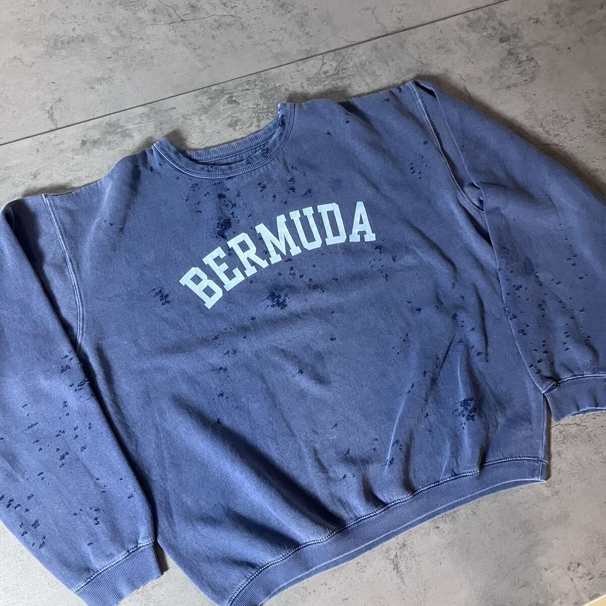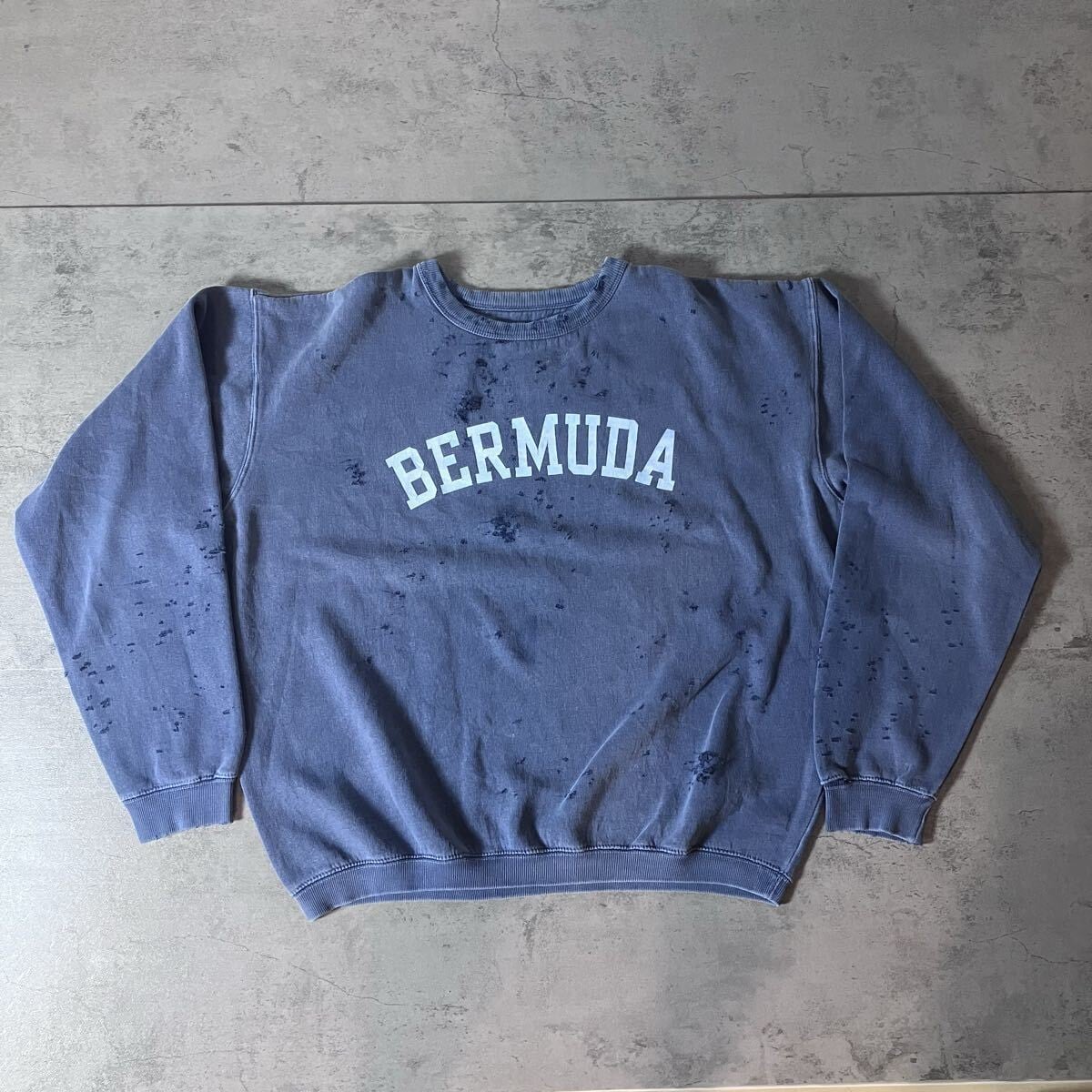 AUSTINS INC.製の“BERMUDA”アーチロゴプリントで、ネイビーのボディに色落ち・シミ・ペンキ跡が入り、リアルなUSED感が漂う1枚。