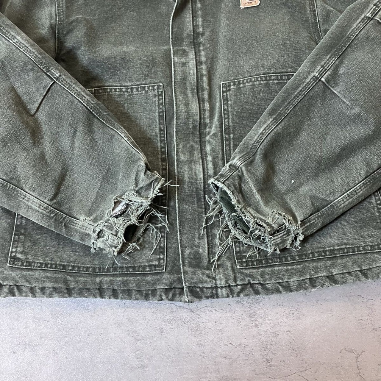 深緑ダックがグレーに抜けた “モスグリーン” の極上エイジング、袖口の自然なクラッシュ、縫い目に走るアタリ。