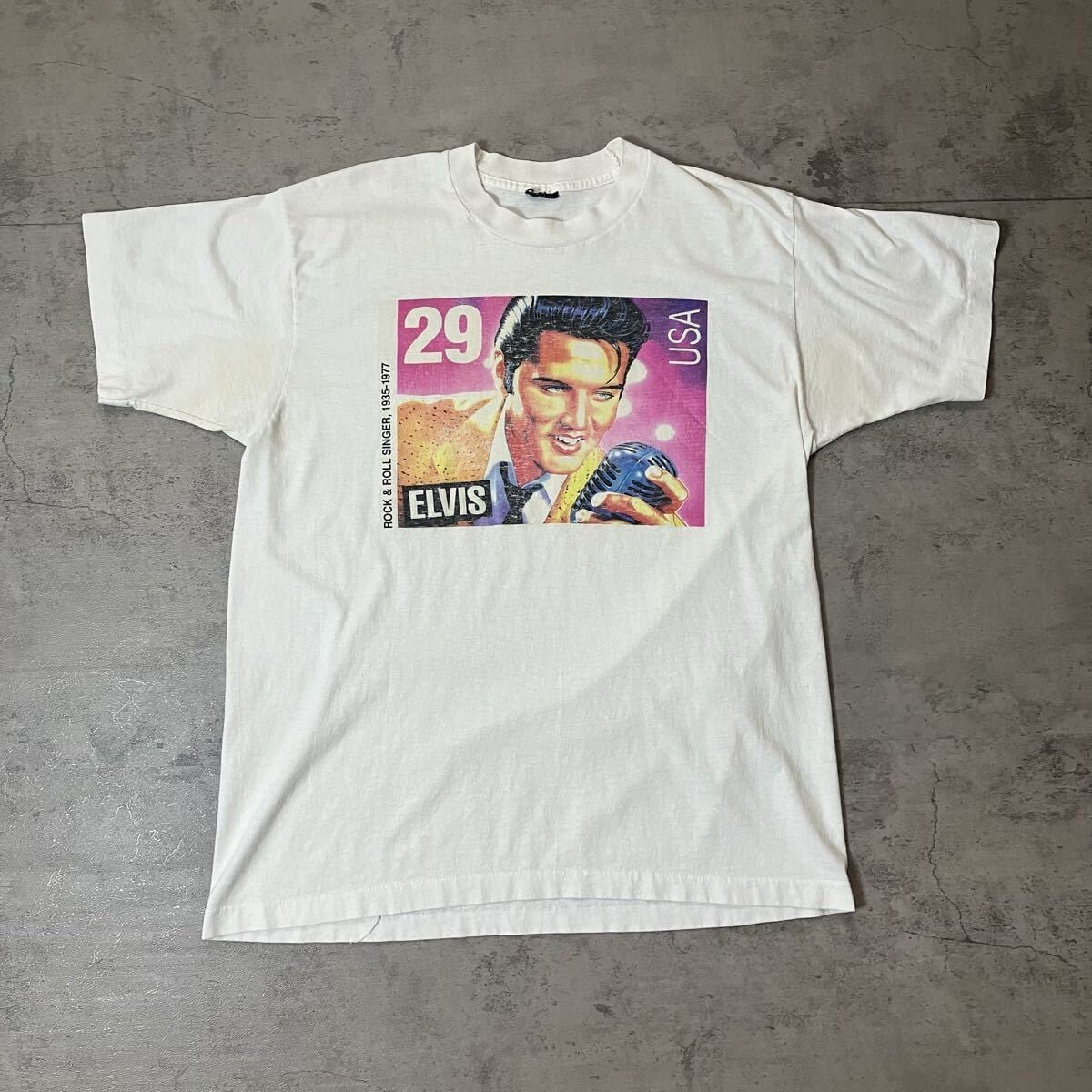90s USA製 フルーツオブザルーム エルヴィス プレスリー プリントTシャツ 切手デザイン 黒タグ Elvis Presley シングルステッチ