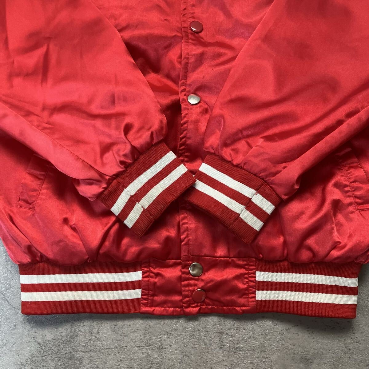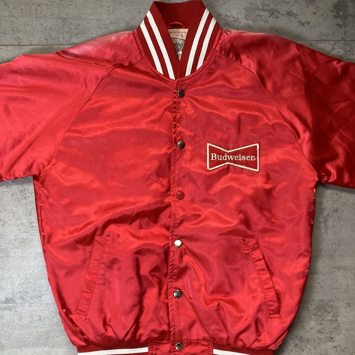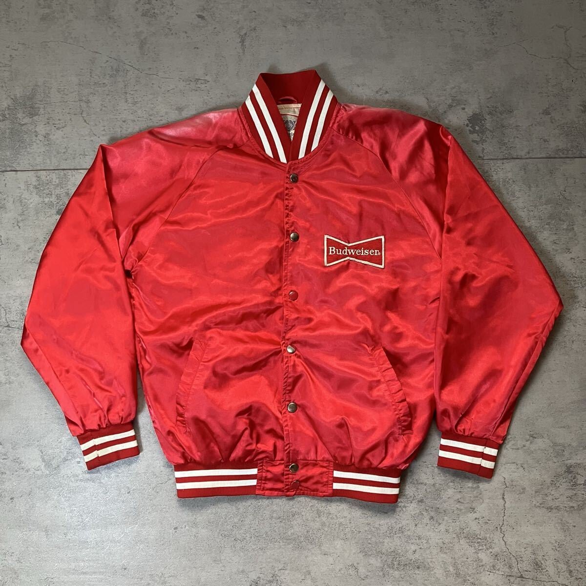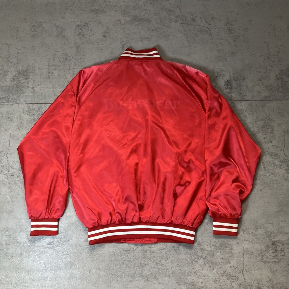 90s USA製 Budweiser サテンスタジャン 赤 バドワイザー 企業ロゴ ヴィンテージ M〜L相当 ラグランスリーブ ジャケット バドワイザー