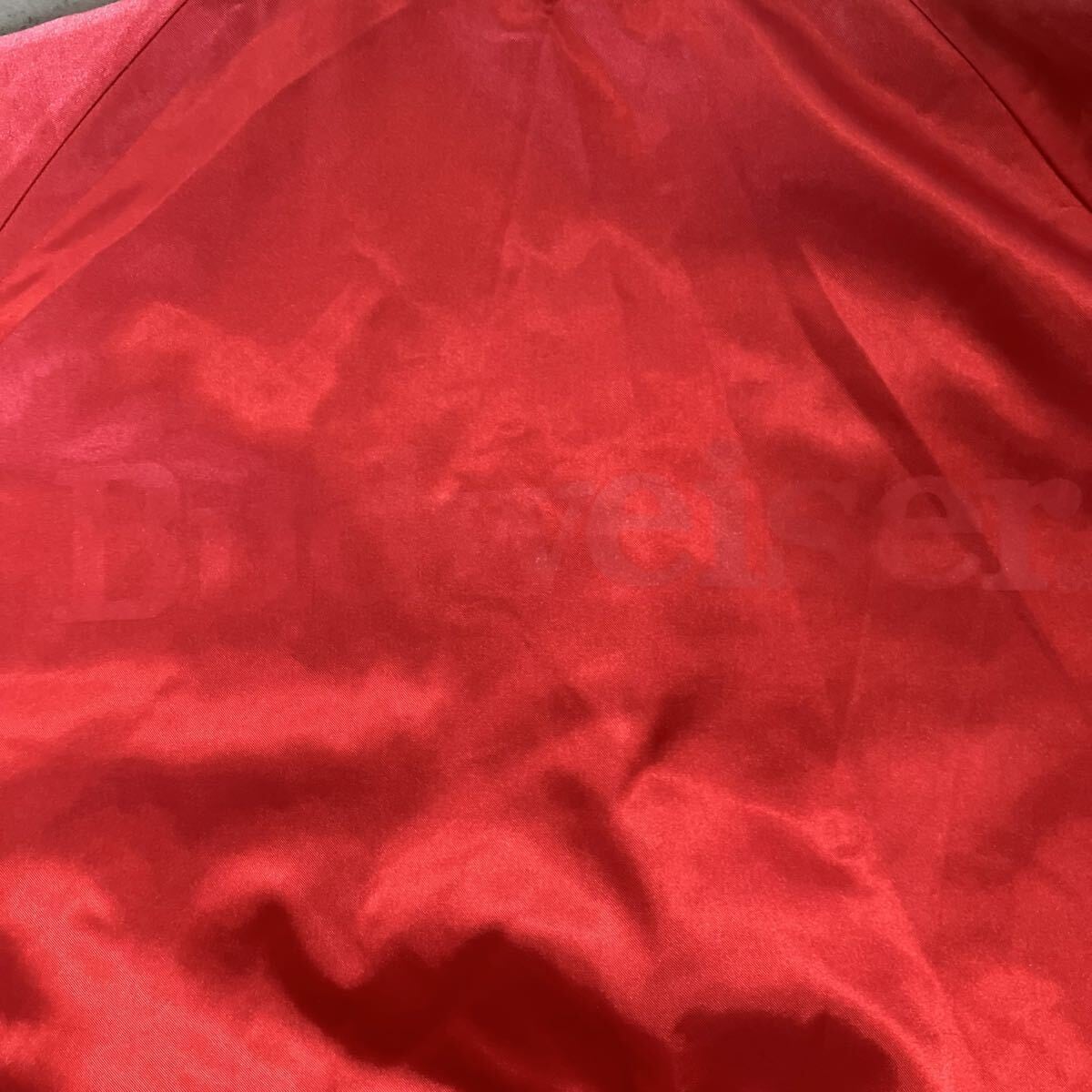 鮮烈なレッドが目を引くBudweiserのサテンスタジャン。フロントのワッペンロゴに加えて、バックにうっすら入るプリントが雰囲気抜群の一着。